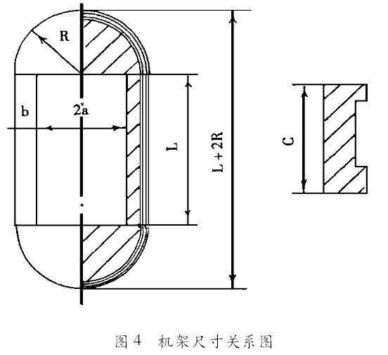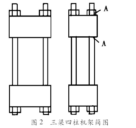 液壓壓磚機立柱的合理設計是整個機架設計的基礎,機架的總體尺寸與立柱的截面尺寸有著密切的關系。對于陶瓷壓磚機的單牌坊機架,其尺寸關系如圖4。